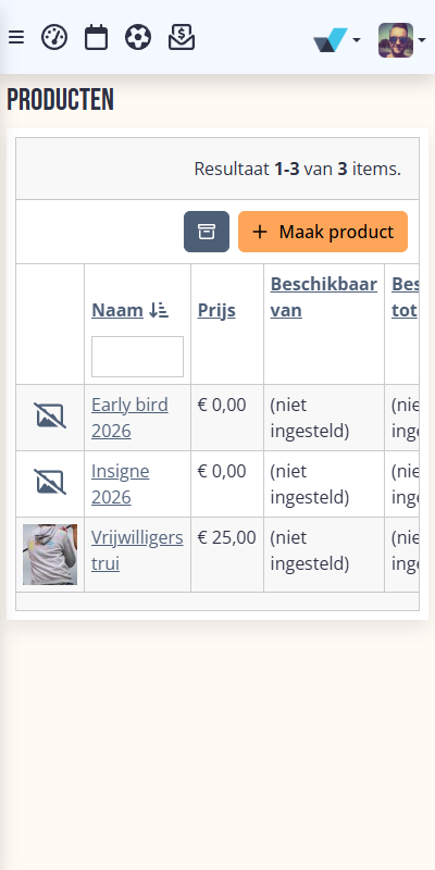 Soms hoort er bij een inschrijving meer dan alleen de inschijving, denk aan een trui, shirt, consumptiebonnen enzovoort. Nu is het mogelijk om extra producten mee te verkopen. Bekijk deze pagina hoe dit gebruikt kan worden.