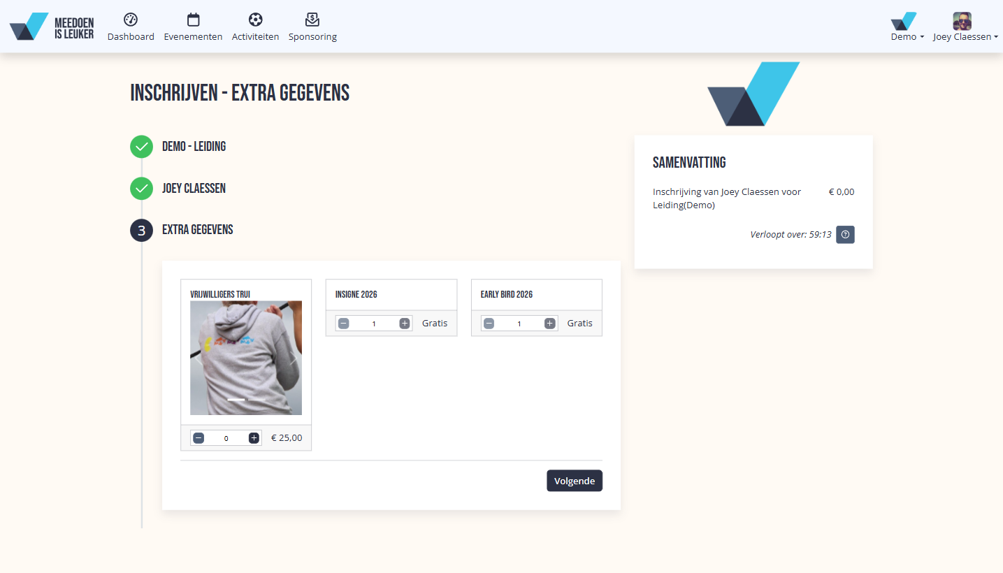 Soms hoort er bij een inschrijving meer dan alleen de inschijving, denk aan een trui, shirt, consumptiebonnen enzovoort. Nu is het mogelijk om extra producten mee te verkopen. Bekijk deze pagina hoe dit gebruikt kan worden.